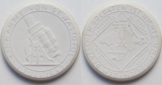 Diameter: 48 mm Manufactured by: Meissen Obverse: View on a German siege cannon as used by the Germans to shell Sevastopol, EINNAHME VON SEWASTOPOL, 1 JULI 1942 around (Translated: Capture of Sevastopol, 1st July 1942)