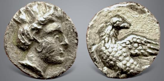 Bactria, Pre-Seleukid Era, Local issues in the Oxus region, (Circa 305-294 BC). AR Obol. 0.32gm, 7.23mm, Uncertain mint in the Oxus region. Head of Kybele or Tyche right, wearing mural crown / Eagle standing left, head right, with wings spread. Zeno-355747 (It's me there), CNG, Triton XIV, lot 409, Extremely Rare and Superb example. Much better in hand as photos have been taken with mobile and its difficult to get all the details of small obol like this. Notes: The presence of Kybele/Tyche on a coin this far east and at this time is