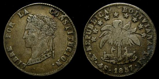 Bolivia, Republic, AR 4 soles (32 mm, 13.05 g) 1857-PTS FJ Potosi Mint EF