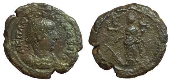 Obv: Α Κ Μ ΑΝ ΓΟΡΔΙΑΝΟϹ ƐΥϹƐΒ, laureate and cuirassed bust of Gordian III, right, seen from front, with gorgoneion. Rev: Tyche standing left, holding rudder and cornucopia, LƐ = year 5.