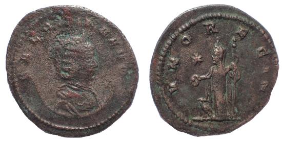 | Salonina. Augusta, AD 254-268. Antoninianus 22 mm. 2.9 gm. Antioch mint. 7th-10th emissions of Gallienus, AD 263. Obv: Veiled and draped bust right, wearing stephane; crescent at shoulder. Rev:/ Juno standing left, holding patera and scepter; star to upper left, peacock at feet to left. RIC V 92; MIR 36, 1619m var. (crescent in place of star) |