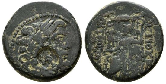 SYRIA, Seleucis and Pieria. Antioch. Pseudo-autonomous issue. Æ Tetrachalkon (23mm, 11.73 g, 1h). Dated year 19 of the Pompeian Era (48/7 BC). Laureate head of Zeus right; c/m: head of Cleopatra VII(?) right within oval incuse / Zeus Nikephoros seated left; [IΘ or ΘΙ] in exergue; all within laurel wreath. McAlee 43 or 44; RPC I 4216; DCA 384; HGC 9, 1366; for c/m: McAlee p. 74, note 25. Very Fine, dark green patina with earthen deposits. (Best clear EF countermark of Cleopatra.)