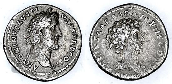 | TCRIS-123, Antoninius Pius and Marcus Aurelius issue 140 AD Silver denarius 3.10 gm Rome mint, issued AD14, obv: ANTONINVS AVG PI VS P P TR P COS III, Laureate head to the right, rev: AVRELIUS CAES AVG PII F COS, bare-headed bust of Marcus Aurelius draped to right. S.4523, RIC.417c, RSC.22 VF/gF very scarce |