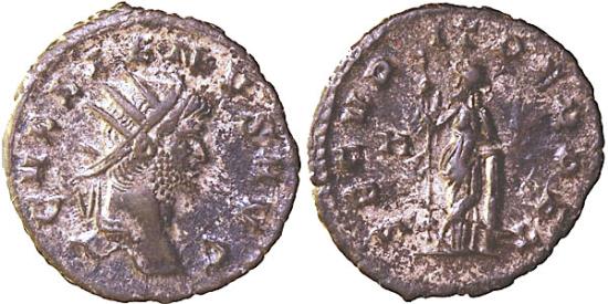 | TCRIS-265, Gallienus, Sole reign AR 2.84 gm 21 mm Antoninianus, Rome mint, 60+% silvered, 253-268 AD. Obv: GALLIENUS AVG Radiate head right. Rev: SECURIT PCRPCT. Securitas std facing left scepter in right hand, left arm resting on column RIC 280. a EF |