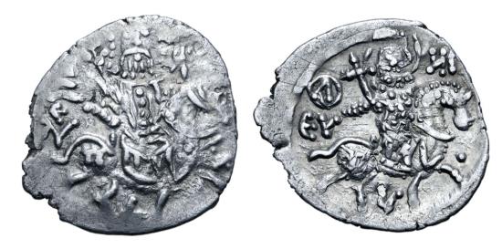 Empire of Trebizond, Alexius II Comnenus AR Asper. AD 1297-1330. St. Eugenius on horseback to right, holding cruciform sceptre; A ЄV-NI across fields, lis below / Alexius on horseback to right, holding lis-tipped sceptre; AЄZO-KO across fields, lis below, star in upper right field. Bendall 52; Sear 2619. 1.67g, 22mm, 6h. Extremely Fine.