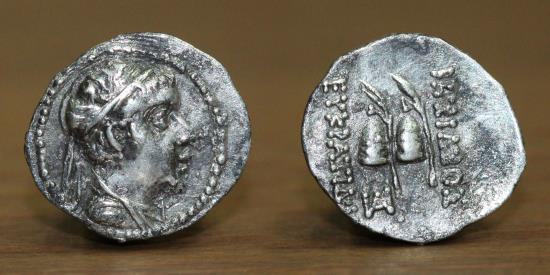 OBV: Diademed and draped bust of Eukratides right. REV: The caps of the Dioskouri, each with a palm frond behind, monogram below.