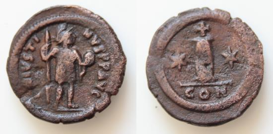 | Justin I. 518-527. Æ Decanummium (21mm, 4.4g, ). Constantinople mint. Struck 522-527. Justin II, helmeted, draped, and cuirassed, standing right, holding spear and globe / Large I |