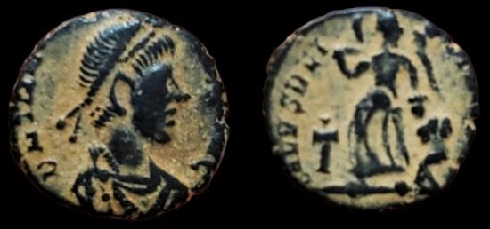 | [Contemporary imitation] Theodosius I. AE4 383-392 AD. Uncertain mint, after Antioch or Alexandria. DN THEODO-SIVS PF AVG, pearl diademed, draped and cuirassed bust r. / SALVS REPVBLICAE, Victory dragging captive, trophy on shoulder, disjointed cross in l. field. cf. 13mm, 0.99g. RIC.Antioch.67.b. |