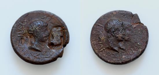 | THRACIAN KINGDOM: Rhoemetalkes I, with Augustus, 11 BC-12 AD, AE 24mm (11g), RPC-1711; Youroukova-204; jugate heads of diademed Rhoemetalkes and queen Pythodoris right, BAΣIΛEΩΣ POIMHTAΛKHΣ // bare head of Augustus right, KAIΣAPOΣ ΣEBAΣTOY Extremely rare Two Countermarks Very Fine |