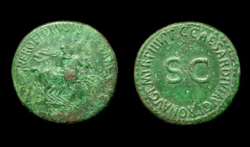 Obv/ NERO ET DRVSVS CAESARES; Nero & Drusus on horseback riding right, cloaks flying.