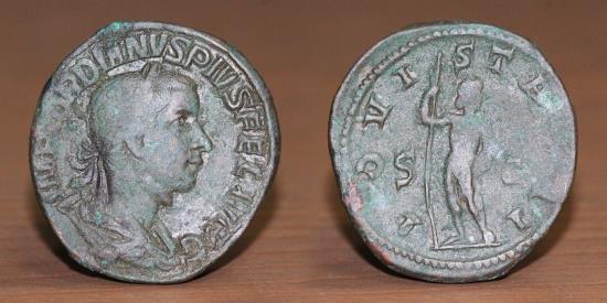 Roman Empire. Gordian III AE Sestertius. Rome, AD 241-243. "IMP GORDIANVS PIVS FEL AVG"; laureate, draped and cuirassed bust to right. / "IOVI STATORI"; Jupiter standing facing, head to right, holding thunderbolt and sceptre; "S-C" across fields.