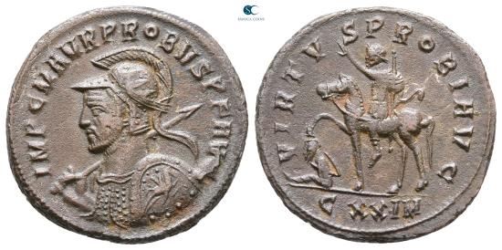 IMP C M AVR PROBVS P F AVG, Radiate, helmeted and cuirassed bust to left, holding spear over shoulder and shield decorated with emperor on horseback to right / ADVENTVS PROBI AVG/ CXXIM, emperor on horseback to left, holding sceptre and with raised right hand, stepping past captive seated to left.