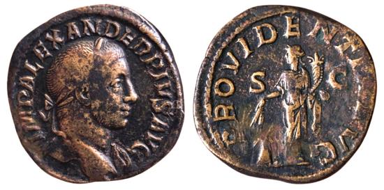 | Severus Alexander, 222–235 Æ Sestertius 231-235, IMP ALEXANDER PIVS AVG Laureate bust r., with drapery on l. shoulder. Rev. PROVIDENTIA AVG S – C Providentia standing l., holding barley ears and cornucopiae; at her feet, modius with barley ears. C 503. BMC 883. RIC 642. 20.10 g. |