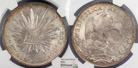 AR 8 Reales Guadalajara Mint. Assayer T.B. Eagle standing left on cactus, head reverted; devouring snake; floral sprays below. Radiant Liberty cap. KM 377.6; DP Ga66 Flashy lustre; somewhat proof-like on reverse. Attractive light toning near rims. A choice example. 537,000 struck. NGC pop (1/1). Click here to follow our store and receive e-mail notifications when new items are added. |