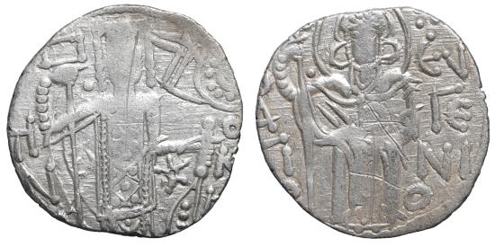| Trebizond Empire. Manuel I Comnenus (1238-1263 AD). AR Asper. 2.85 gr. – 20.3 mm. O:\ HNΛ - OKH, Emperor standing facing, holding labarum and akakia. R:\ OAΓI - EVΓENI, St. Eugenios standing facing, holding long cross. cf. Sear 2601 | Sommer T3.9.1var. | Boutin- | cf. Retowski 70-75. VF+ |