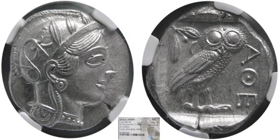 PCW-G7483-ATTICA, Athens. 440-404 BC. Silver Tetradrachm (17.20 gm; 25 mm). NGC-MS. Helmeted head of Athena right / Owl standing right, head facing; olive sprig and crescent behind. SNG Copenhagen 31; Starr pl. XXII, 7. NGC-MS (Strike 5/5; Surface 5/5). Certificate # 6674486-006. Lovely style and strike. Fully lustrous. Great example for the issue. |