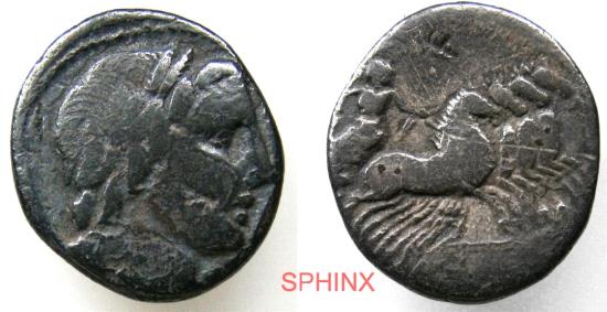 119GG4K) Roman Republic, Anonymous, Circa 86 BC.Rome mint. AR Denarius. 3.52 Grms, 18 mm, Obverse: Laureate head of Apollo right. Reverse: Jupiter driving galloping quadriga right.