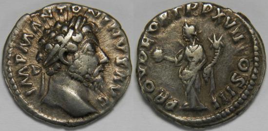 Laureate bust right / Providentia standing left, holding globe and cornucopia.