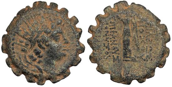 AE Serrate AE18 4.45g. 18mm. Probably Ptolemais (Ake) mint Radiate and diademed head, r.; dotted border. Nike standing l., crowning epithets with wreath and holding palm branch; AB monogram over E in outer l. field. BASILEWS ANTIOXOU EPIFANOUS DIONUSOU SC 2024 Scarce. Dark brown patina with some reddish fill. Some minor roughness. Reverse a bit off center.