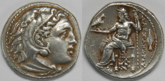 Kingdom of Macedon Philip III Arrhidaios AR Drachm 323-317 BC Head of Herakles right, wearing lion skin / Zeus Aëtophoros seated left; bee left under throne; spearhead in outer right field. In the name and types of Alexander III (the Great). Struck in circa 323-319 BC, Magnesia. 4.26 grams, 17 mm. Extremely Fine. Minor marks and scratches. Price 1938, Müller 323. Purchased from Solidus Numismatik, München. |