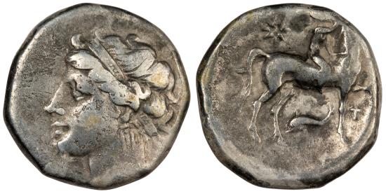 AR Nomos (Didrachm) 7.20g. 20mm. Diademed head of Satyra l., wearing triple-pendant earring. Nude youth on horseback r., placing wreath on horse's head; star above, dolphin below, TA below raised foreleg. SNG ANS 1301 Patchy toning. Scarcer variety. Some patches of porosity.
