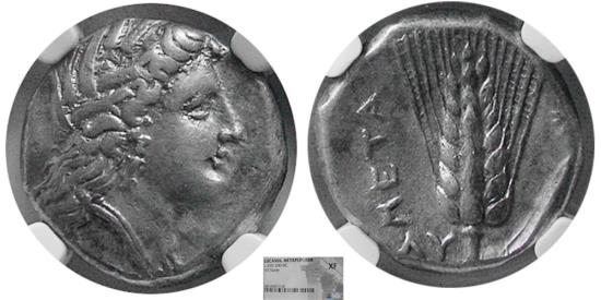 PCW-G7504-LUCANIA, Metapontum. Circa 330-280 BC. AR Stater. NGC-XF. Obv: Head of Demeter right, wearing necklace, triple-pendant earring. Rx: META upward at left, barley ear, leaf to right with 16-pointed star above; ΛY below ethnic. Johnston, Metapontum-C8. NGC-XF. Certificate # 5872807-018. Lightly toned. |