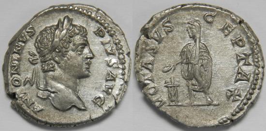 Roman Empire Caracalla AR Denarius (Rome, AD 206-210) Laureate head right / Caracalla, veiled and togate, standing left, sacrificing from patera over tripod. 3.50 grams, 19 mm. Good Extremely Fine. Attractive piece. Tiny edge split. RIC 179, RSC 689. Purchased from Solidus Numismatik, München. |