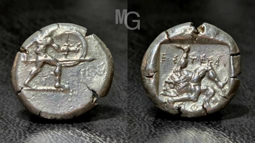 PAMPHYLIA, Aspendos. Circa 465-430 BC. AR Stater. Warrior advancing right, holding shield and spear / Triskeles; "EΣ-TFEΔI" above; below, lion leaping left above "ΠΦ"; all within incuse square. Bright surfaces, a little off center, minor die wear.