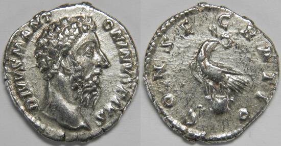 Roman Empire Divus Marcus Aurelius AR Denarius (Rome, AD 180) Bare head right / Eagle standing left on globe, head right, holding wreath in beak. Consecration issue, struck under Commodus. 2.85 grams, 18 mm. Extremely Fine. RIC 274 (Commodus), RSC 88. Purchased from Solidus Numismatik, München. |