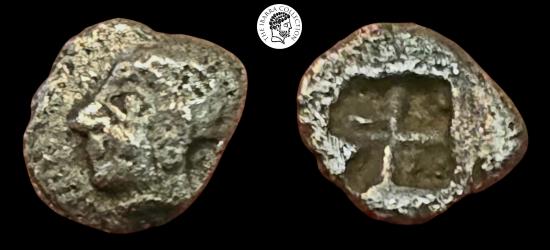 | Phokaia, Ionia, AR Diobol, Circa 521-478 BC, Head of Athena left, wearing close-fitting helmet and earring / irregular incuse. 9mm, 0.13g. SNG Kayhan 525, Cahn 11. Toned VF. |