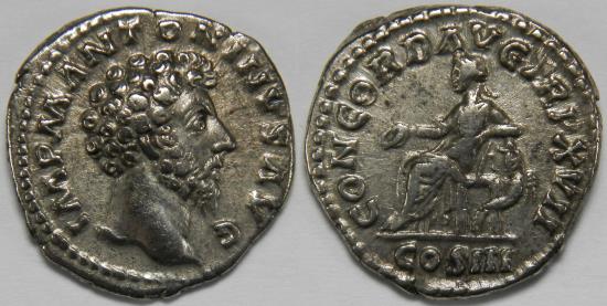 Roman Empire Marcus Aurelius AR Denarius (Rome, AD 163) Bare head right / Concordia seated left, holding patera, resting elbow on statuette of Spes; cornucopia under seat. 3.22 grams, 18 mm. About Extremely Fine. RIC 59, RSC 37. Purchased from Savoca Numismatik, München. |