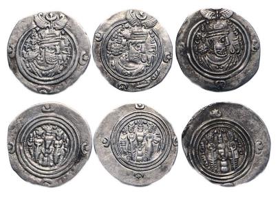 Sasanian coins: Set of three high grade silver drachms, 7th. century AD