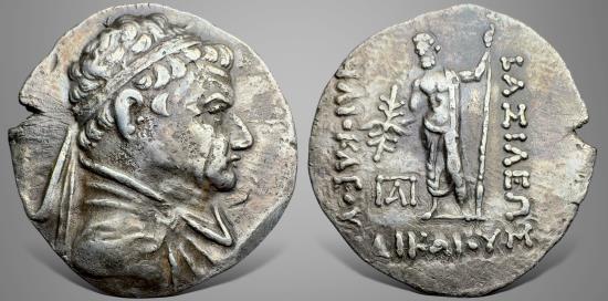 lotus-tipped sceptre in left, ΒΑΣΙΛΕΩΣ to right, ΗΛΙΟΚΛΕΟΥΣ to left,