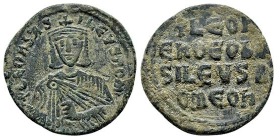 Leo VI Minted: Constantinople Size: 25.64mm Weight: 7.47 grams Obverse: + LEOn bAS-ILEVS ROM Crowned bust of Leo facing, wearing chlamys, holding akakia in left hand Reverse: + LEOn En ΘEO bA SILEVS R OMEOn In four lines.