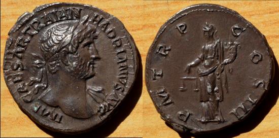IMP CAESAR TRAIAN HADRIANVS AVG, laureate bust right, drapery on far shoulder / P M TR P COS III, Aequitas standing left with scales and cornucopiae.