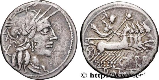 PAPIRIA Denier 121 AC. Rome silver Obverse : Anépigraphe Tête casquée de Rome à droite ; derrière la tête, marque de valeur, X Reverse : ROMA dans un cartouche à l’exergue ; CARB au-dessus du cartouche Jupiter dans un quadrige galopant à droite brandissant un foudre de la main droite et tenant un sceptre et les rênes de la main gauche Commentary : Monnaie centrée. Joli revers. Usure régulière. Patine grise