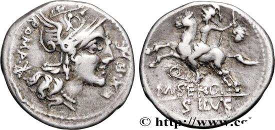 SERGIA Denier 116-115 AC. Rome silver Obverse : ROMA/ EX. S. C. Tête casquée de Rome à droite ; derrière la tête, marque de valeur, (XVI en monogramme) Reverse : Q/ M. SERGI// SILVS Cavalier casqué bondissant à gauche, brandissant une épée et tenant de la main gauche une tête coupée et de la main droite, un bouclier Commentary : Monnaie centrée. Joli portrait de Rome. Revers agréable à l’usure régulière. Patine grise