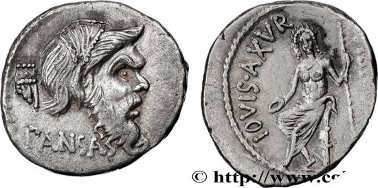 VIBIA Denier 48 AC. Rome silver Obverse : PANSA Masque barbu de Pan à droite ; derrière la tête, symbole Reverse : C. VIBIVS. C. F. C. N./ IOVIS AXVR Jupiter Axurus assis de face, la tête de face, lauré, nu jusqu’à la ceinture, tenant une patère de la main droite et un sceptre de la main gauche Commentary : Superbe monnaie sur un flan légèrement décentré au revers. Très beau masque de Pan ainsi qu’un revers finement détaillé. Patine grise avec de légers reflets dorés