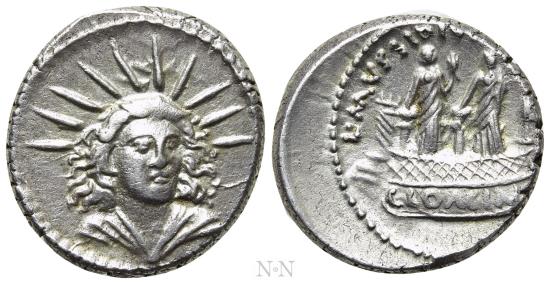 Obv: Radiate and draped bust of Sol facing slightly right. Rev: L MVSSIDIVS LONGVS / CLOACIN. Shrine of Venus Cloacina: Circular platform surmounted by two statues of the goddess, each with hand upon cippus. Crawford 494/43a; CRI 189; RBW 1747. The small temple of Venus Cloacina was linked to the Cloaca Maxima, which in this area headed toward the Roman Forum, built on the Via Sacra near the area of the Tabernae Novae. The shrine was dedicated to Venus protector of the Cloaca Maxima, the most important of ancient Rome's sewers. The deity was identified as the Goddess Cloacina, of Etruscan origin; after all, it was the Etruscans who taught the Romans about swamp draining and sewers. According to others, however, the nickname Cloacina comes from 'cluere' (=purify), for the ceremony used by Romans and Sabines in reconciling, purifying themselves of the blood they had shed among themselves. On this coin we see a small open-air shrine with a low circular enclosure that contained two cult statues, probably depicting ancient Cloacina and Venus, which eventually merged into Venus Cloacina. Condition: Good very fine; luster in field. Weight: 3.88 g. Diameter: 18 mm. |
