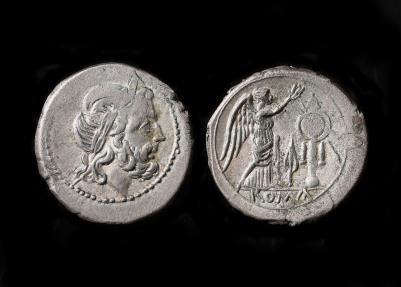 Anonymous Ar Victoriatus, c. 211-207 BC. Southeast Italian mint. Laureate head of Jupiter r. Rev., ROMA in ex., Victory standing r., crowning trophy, upright spearhead in lower centre. Cr 83/1a; Syd 223; RSC 24m; Sear 50.