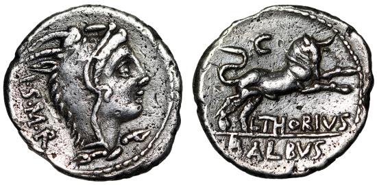 | L Thorius Balbus AR Denarius "Juno Sospita & Bull Charging" Good Very Fine |