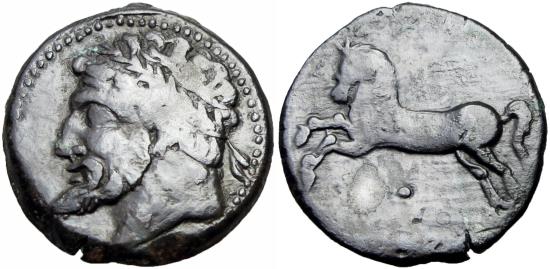 KINGS of NUMIDIA. Massinissa or Micipsa. 203-148 BC or 148-118 BC. Æ Unit (26mm, 12.65 g, 12h). Cirta mint. Laureate head left / Horse galloping left; pellet below. MAA 18a; Mazard 50; SNG Copenhagen 505. VF, dark patina. Well centered for issue.
