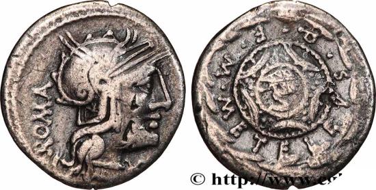CAECILIA Denier 127 AC. Rome R2 silver Obverse : ROMA Tête casquée de Rome à droite, coiffée du casque ailé ; sous le menton, marque de valeur (XVI) en monogramme Reverse : M. METELLVS. Q. F. Bouclier macédonien dans une couronne de laurier, orné en son centre d’une tête d’éléphant Commentary : Flan très légèrement décentré. Jolie tête au droit, un petit coup est à noter. Patine grise aux légers reflets bleutés FR : Pour ce type, M. Crawford a relevé une estimation de quarante-quatre coins de droit et de cinquante-cinq coins de revers EN : For this type, Mr. Crawford noted an estimate of forty-four right dies and fifty-five reverse dies.