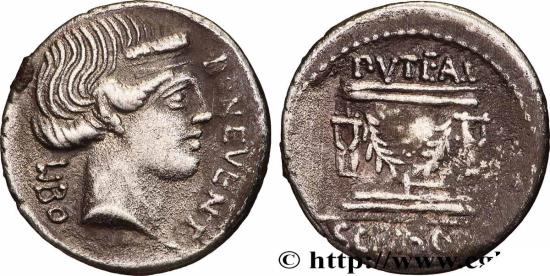 SCRIBONIA Denier 62 AC. Rome silver Obverse : BON EVENT/ LIBO Tête diadémée de Bonus Eventus à droite Reverse : PVTEAL// SCRIBON à lexergue Le puit scribonien orné de deux lyres et de deux branches de laurier ; en bas à gauche, un marteau Commentary : Flan centré. Usure régulière. Patine grise FR : Monnaie nettoyée EN : Cleaned coin