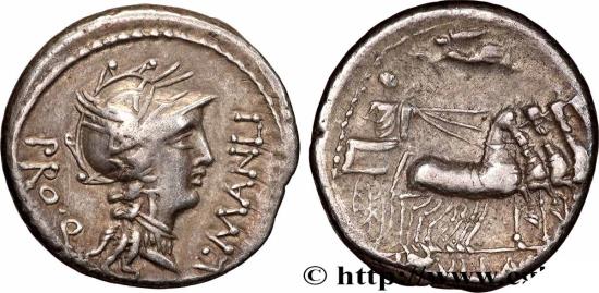 MANLIA Denier 82 AC. Italie R1 silver Obverse : L. MANLI. T - PRO. Q Tête casquée de Rome à droite avec le casque ailé Reverse : L. SVLLA. IM Sylla dans un char triomphal à droite (quadrige) couronné par la Victoire volant à gauche Commentary : Flan un peu court et centré. Joli droit et revers agréable. Patine grise aux reflets dorés FR : Pour ce type, M. Crawford a relevé une estimation de 186 coins de droit et de 207 coins de revers pour trois variétés différentes. Il existe plusieurs variétés de bustes et de revers pour ce type. Les mêmes coins ont pu frapper l’or et l’argent EN : For this type, Mr. Crawford noted an estimate of 186 upright dies and 207 reverse dies for three different varieties. There are several varieties of busts and lapels for this type. The same coins were able to mint gold and silver