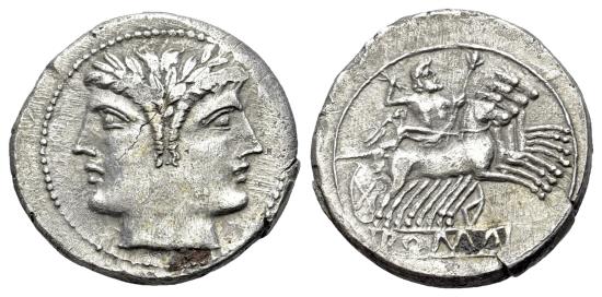 Anonymous (Circa 225-212 BC). AR Didrachm – Quadrigatus (19.5mm, 5.28g, 3h). uncertain Campanian or Apulian mints. Laureate head of Janus R/ Jupiter, hurling thunderbolt and holding scepter, in galloping quadriga driven left by Victory; ROMA in relief on tablet. Crawford 28/3; Sydenham 65; RSC 24; RBW 68. RRSC A6. Good VF