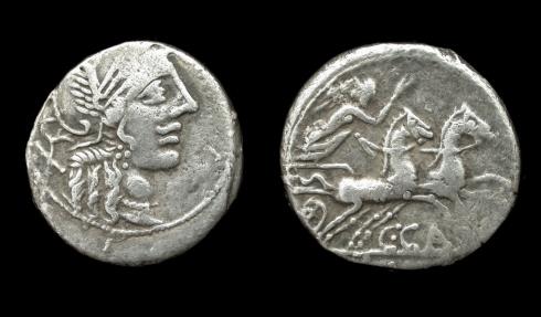 Ave! Roman Republic, C. Cato, Denarius, Victory in Biga reverse Fine Silver; 17mm/3.8gm Rome Mint, ca. 123 BC Con/ Struck off center on a short flan, otherwise, Very Fine Obv/ Helmeted head of Roma right, wearing pearl necklace and pearl earring; X behind. Rev/ C•CATO; Victory holding whip in Biga galloping right; ROMA in exergue [off flan] Ref/ Crawford 274/1; Porcia 1; Sydenham 417 |