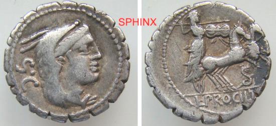 65CGC5W) L. Procilius. 80 BC. AR Serrate Denarius (18.5 mm, 3.81 g). Rome mint. Head of Juno Sospita right, wearing goat-skin headdress / Juno Sospita driving galloping biga right, hurling spear and holding shield and reins; serpent erect below. Crawford 379/2; Sydenham 772; Procilia 2; RBW 1407. Toned with some iridescence, Good VF, deposits on reverse. |