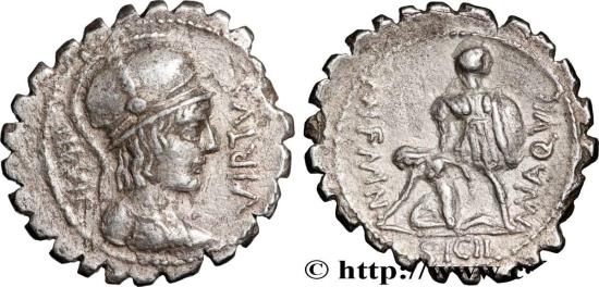 AQUILLIA Denier serratus 71 AC. Rome R1 silver Obverse : III VIR/ VIRTVS Buste casqué de Virtus (la Virilité) à droite Reverse : (MN) AQVIL// (MN). F. (MN) N en monogrammes ; SICIL à lexergue Guerrier debout à droite, tenant un bouclier de la main gauche et relevant une femme agenouillée à gauche Commentary : Monnaie centrée. Joli buste. Revers agréable. Usure régulière. Patine grise FR : Pour ce type, M. Crawford a relevé une estimation de 88 coins de droit et de 98 coins de revers EN : For this type, Mr. Crawford noted an estimate of 88 obverse dies and 98 reverse dies.