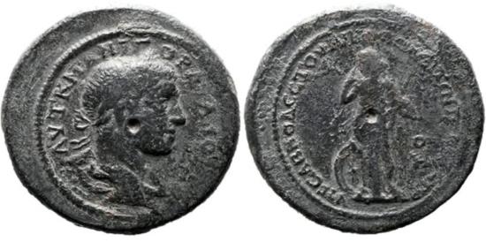 Gordian III (238-244). Moesia Inferior, Nicopolis ad Istrum. Æ (30mm, 16.73g). Sab. Modestus, consular legate. Obv: Laureate, draped and cuirassed bust right. Rev: Nemesis standing left, raising hand to lips, and holding cubit rule; at feet, wheel. RPC VII.2 1290 Note: wide flan and strike